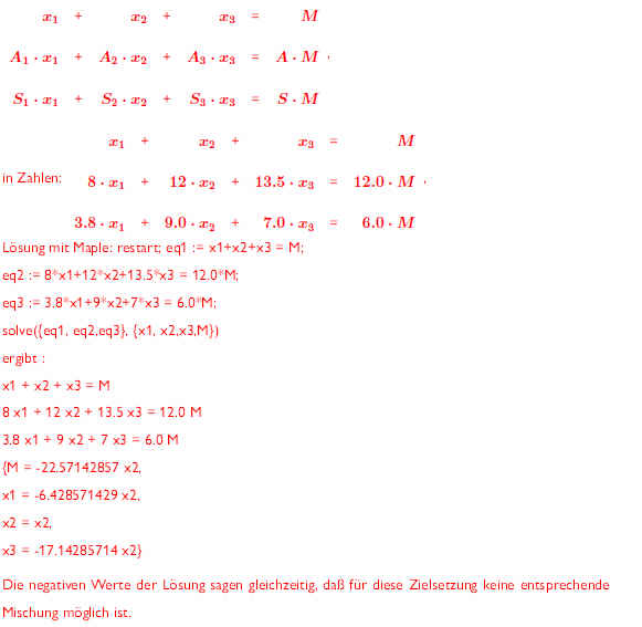 Gegeben sind die drei (zu bestimmenden) Mengen x1, x2 und x3 eines Weins mit dem Alkoholgehalt A1=8 Vol %, A2=12 Vol % und A3=13,5 Vol % , die zusammengemischt werden sollen zu einer (evtl. unbekannten) Gesamtmenge M und einem Gesamt-Alkoholgehalt A= 12 Vol %.